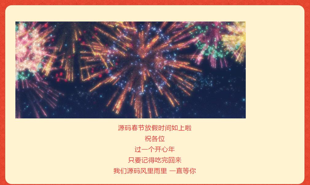 在2021年春节来临之际,源码祝愿广大客户:幸福安康,生意兴隆,事业有成,牛气冲天,根据《国务院办公厅公布2021年春节放假安排》,结合公司实际情况与工作安排,春节放假安排如下: