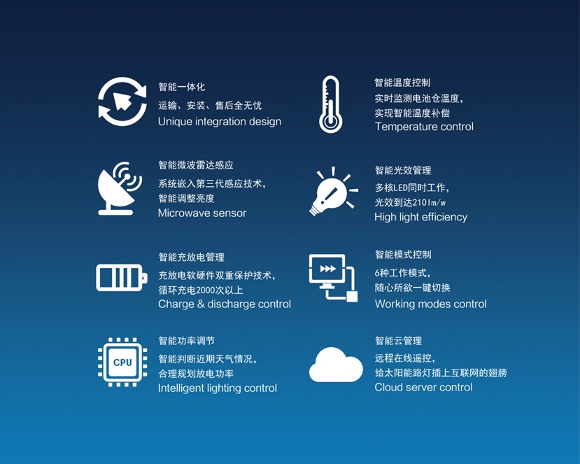 源码不仅在产品的核心配件上追求高标准,在研发的技术领域更是引先于行业。源码太阳能智慧路灯搭载了智能监测与控制系统,集智能一体化、智能微波雷达感应、智能充放电管理、智能功率调节、智能温度调节、智能光效管理、智能模式控制、智能云管理八大核心技术为一体,通过核心技术的组合工作,使路灯更加智能化,有效延长了太阳能路灯的寿命,达到最佳照明效果。