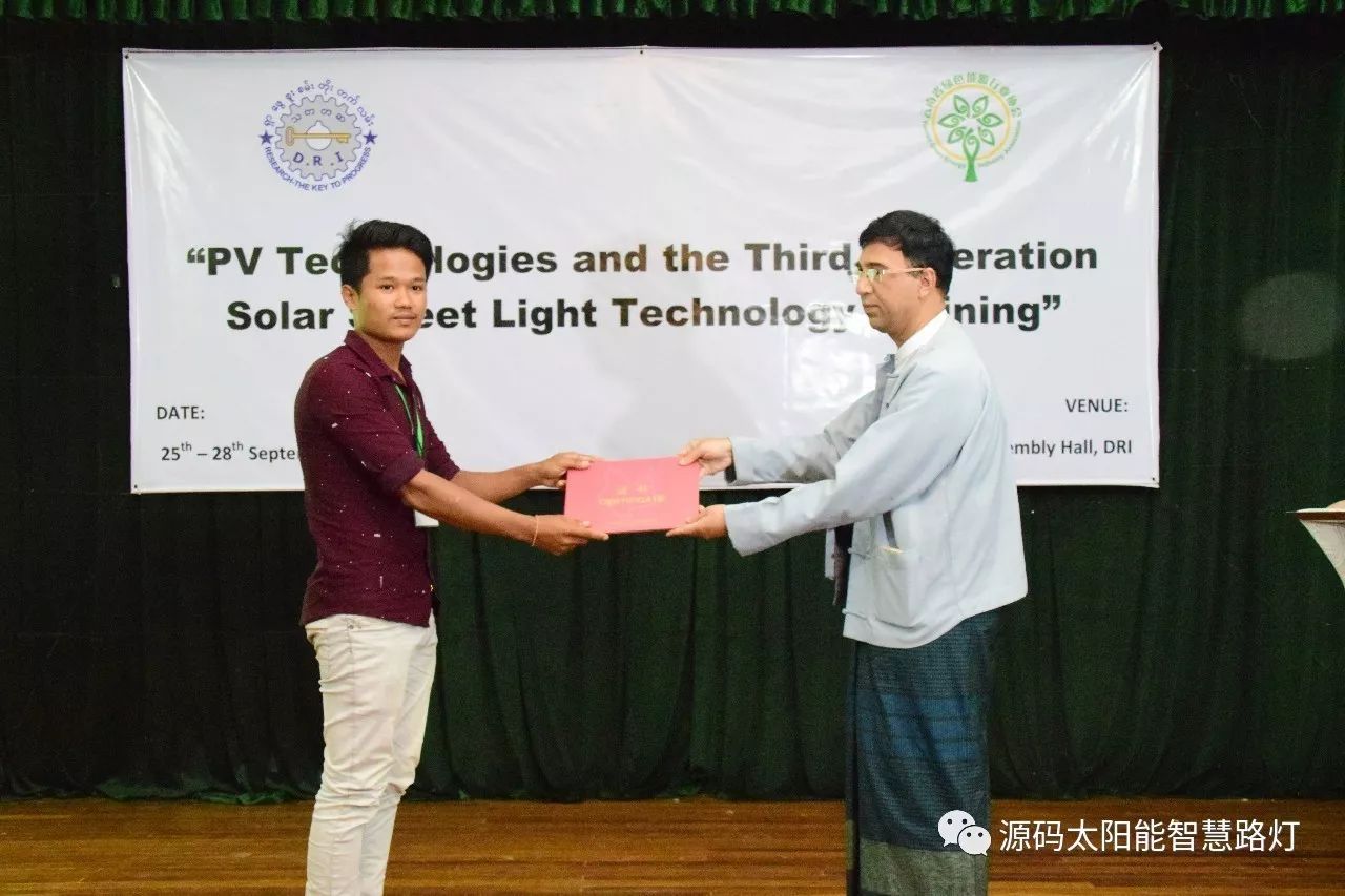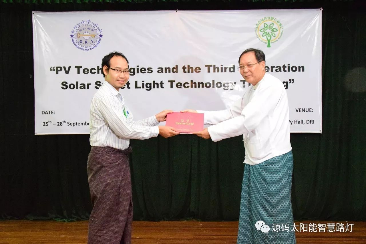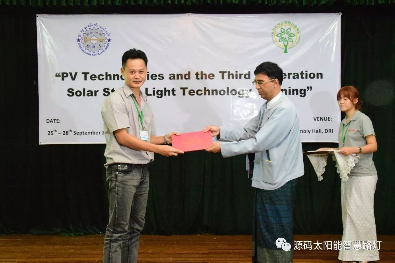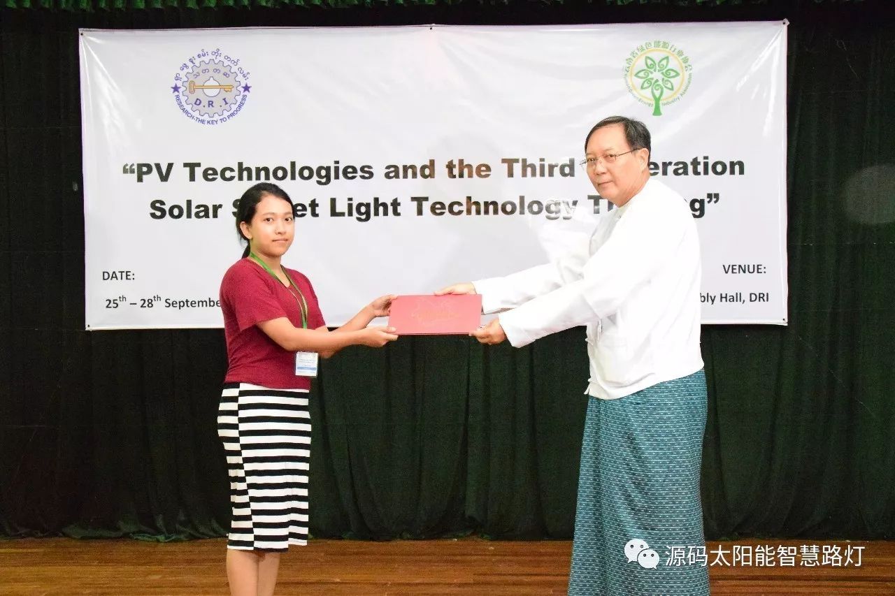 在培训会议后,大家对此次的培训综合内容及取得的效果进行了深入研讨,参与此次培训的能源部、政府部门的相关人员以及大学教授、企业代表都对此次培训会的效果表示满意,也希望以后能有更多的类似的培训会,源码也希望在以后的培训中能够给他们带来更好的效果。研讨会后,中国驻缅甸大使馆领导对本次会议作了总结:对本次培训会议的培训方云南省绿色能源行业协会以及源码太阳能智慧路灯表示感谢,表示此次会议对双方的技术交流学习以及中缅两国友谊的加深都取到了十分良好的效果。接着缅甸教育部科技司司长则亲自向所有通过考试的学员颁发了证书,在颁奖过程中,源码也向缅甸教育部科技司捐赠了两套太阳能智慧路灯。