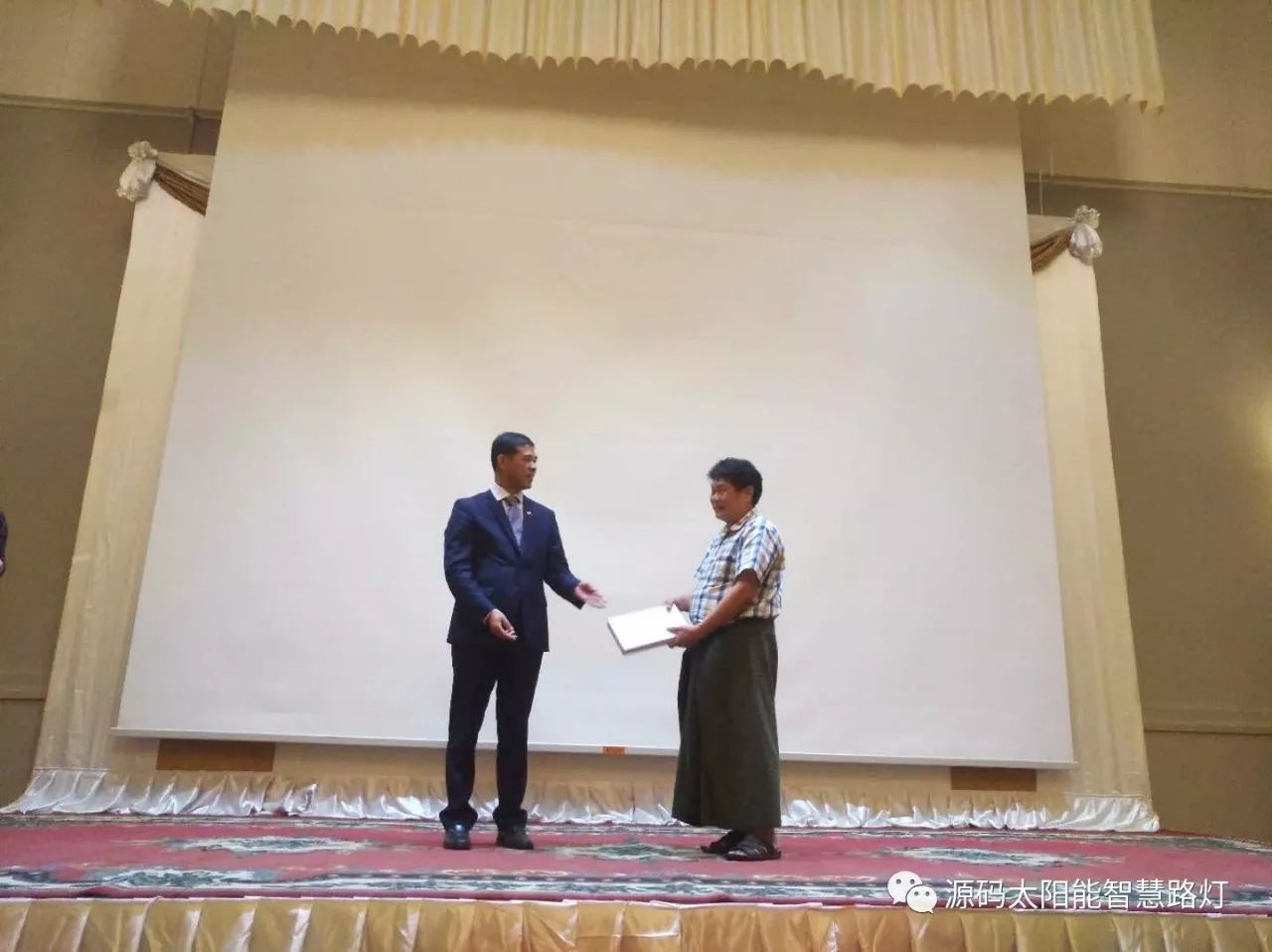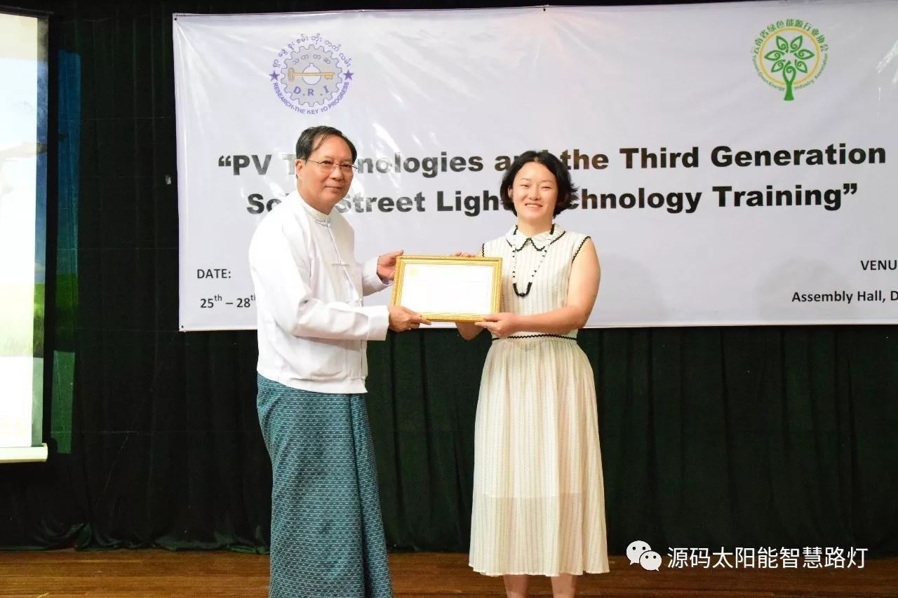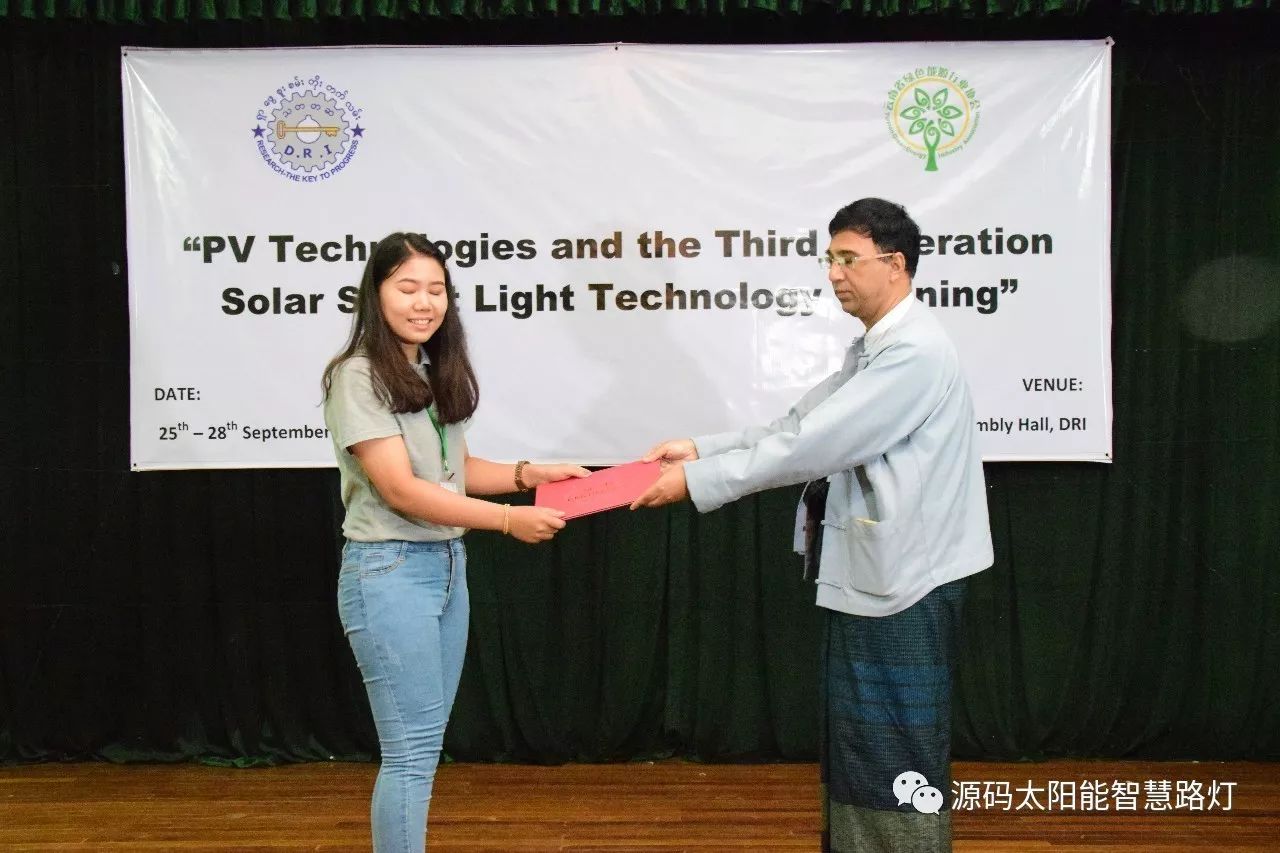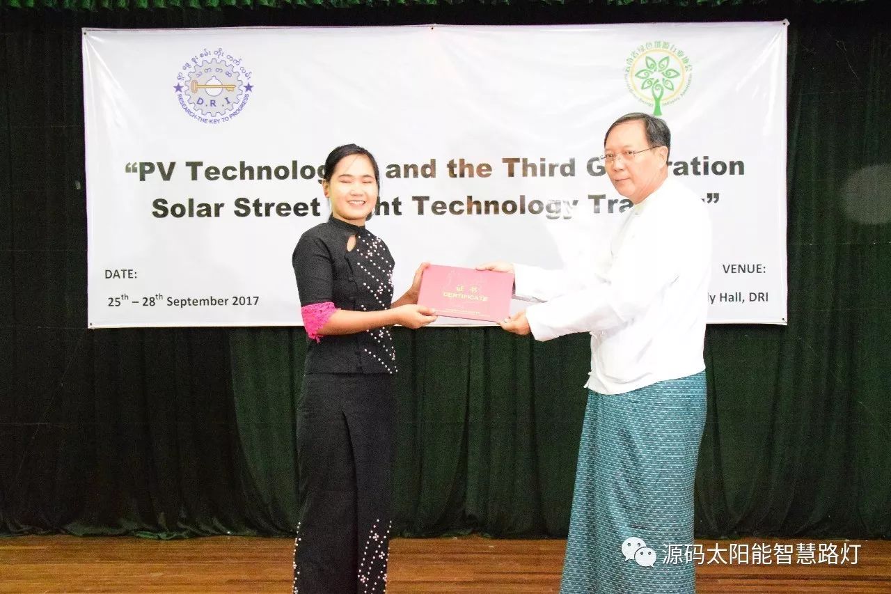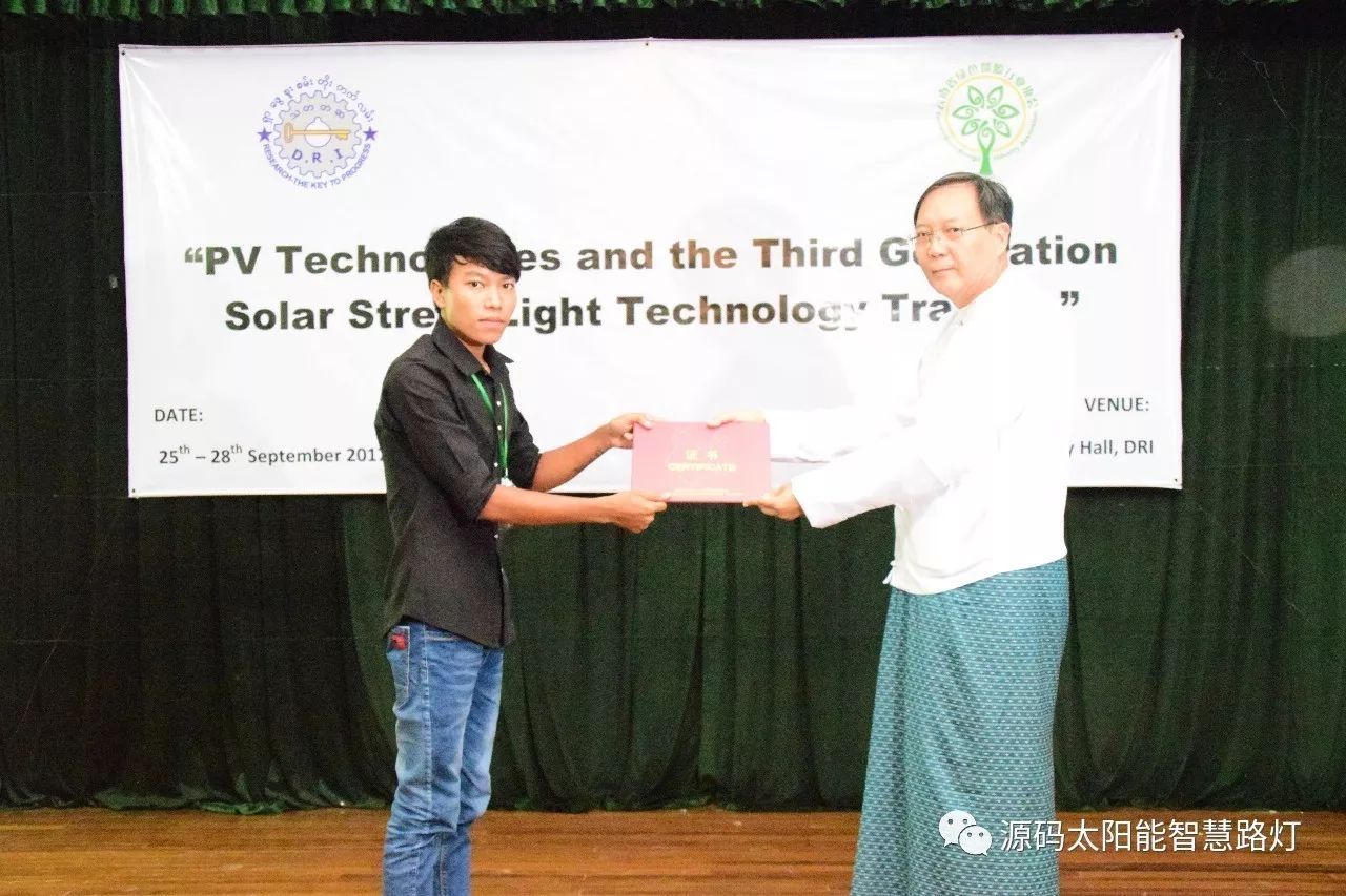 在培训会议后,大家对此次的培训综合内容及取得的效果进行了深入研讨,参与此次培训的能源部、政府部门的相关人员以及大学教授、企业代表都对此次培训会的效果表示满意,也希望以后能有更多的类似的培训会,源码也希望在以后的培训中能够给他们带来更好的效果。研讨会后,中国驻缅甸大使馆领导对本次会议作了总结:对本次培训会议的培训方云南省绿色能源行业协会以及源码太阳能智慧路灯表示感谢,表示此次会议对双方的技术交流学习以及中缅两国友谊的加深都取到了十分良好的效果。接着缅甸教育部科技司司长则亲自向所有通过考试的学员颁发了证书,在颁奖过程中,源码也向缅甸教育部科技司捐赠了两套太阳能智慧路灯。
