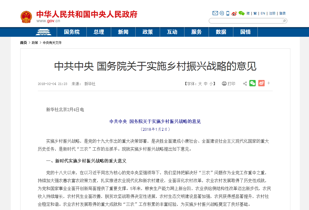 2018年1月2日,公布了2018年中央一号文件,即《中共中央国务院关于实施乡村振兴战略的意见》 。2018年3月5日,国务院总理李克强在作政府工作报告时说,大力实施乡村振兴战略。