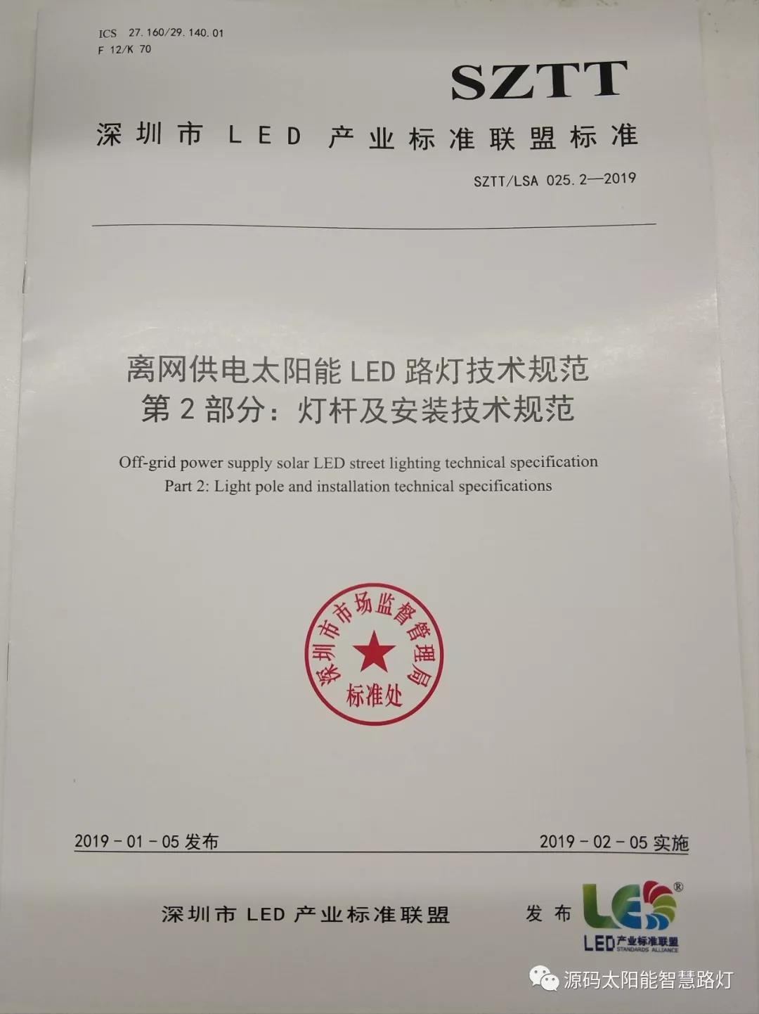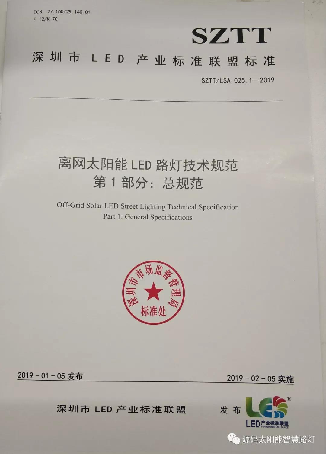 2019年1月5日,深圳市LED产业标准联盟首次正式对外发布了《离网太阳能LED路灯技术规范》联盟标准?!独胪裟躄ED路灯技术规范》联盟标准包含SZTT/LSA 025.1-2019《总规范》和SZTT/LSA 025.2-2019《灯杆及安装技术规范》两部分,主要由深圳源创智能照明有限公司、深圳市计量质量检测研究院、深圳清华大学研究院、深圳市标准技术研究院、国家半导体光源产品质量监督检验中心、广东省南粤质量技术研究院等共同起草。