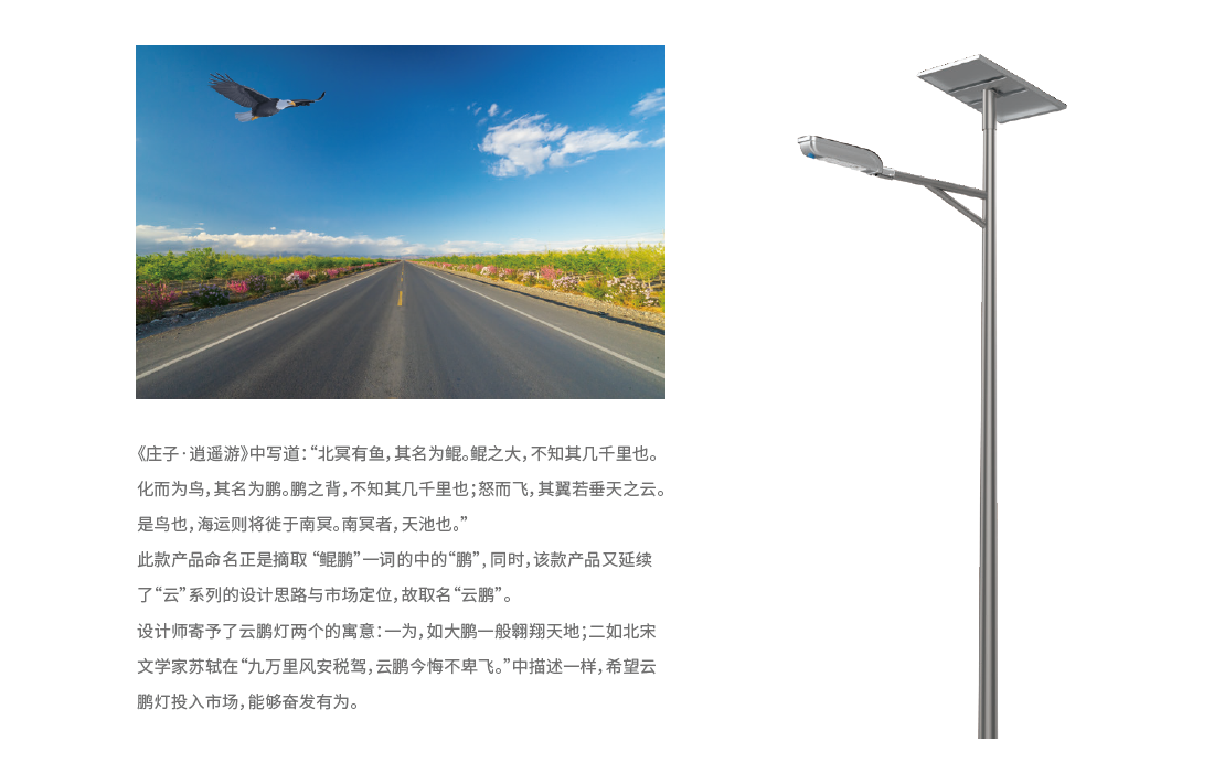 云鹏灯作为中大功率分体式太阳能路灯,被广泛应用于新农村道路、乡镇道路、城郊车道等6-10米的安装场景。